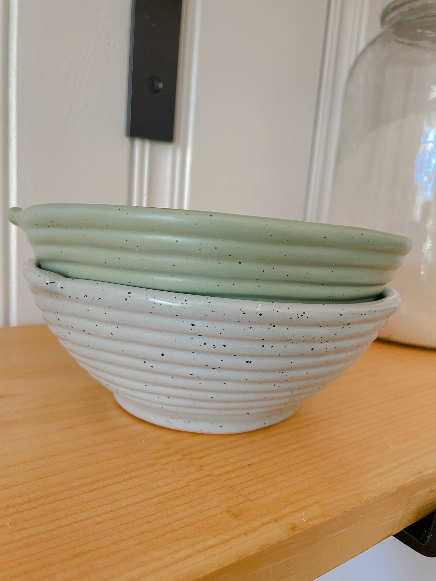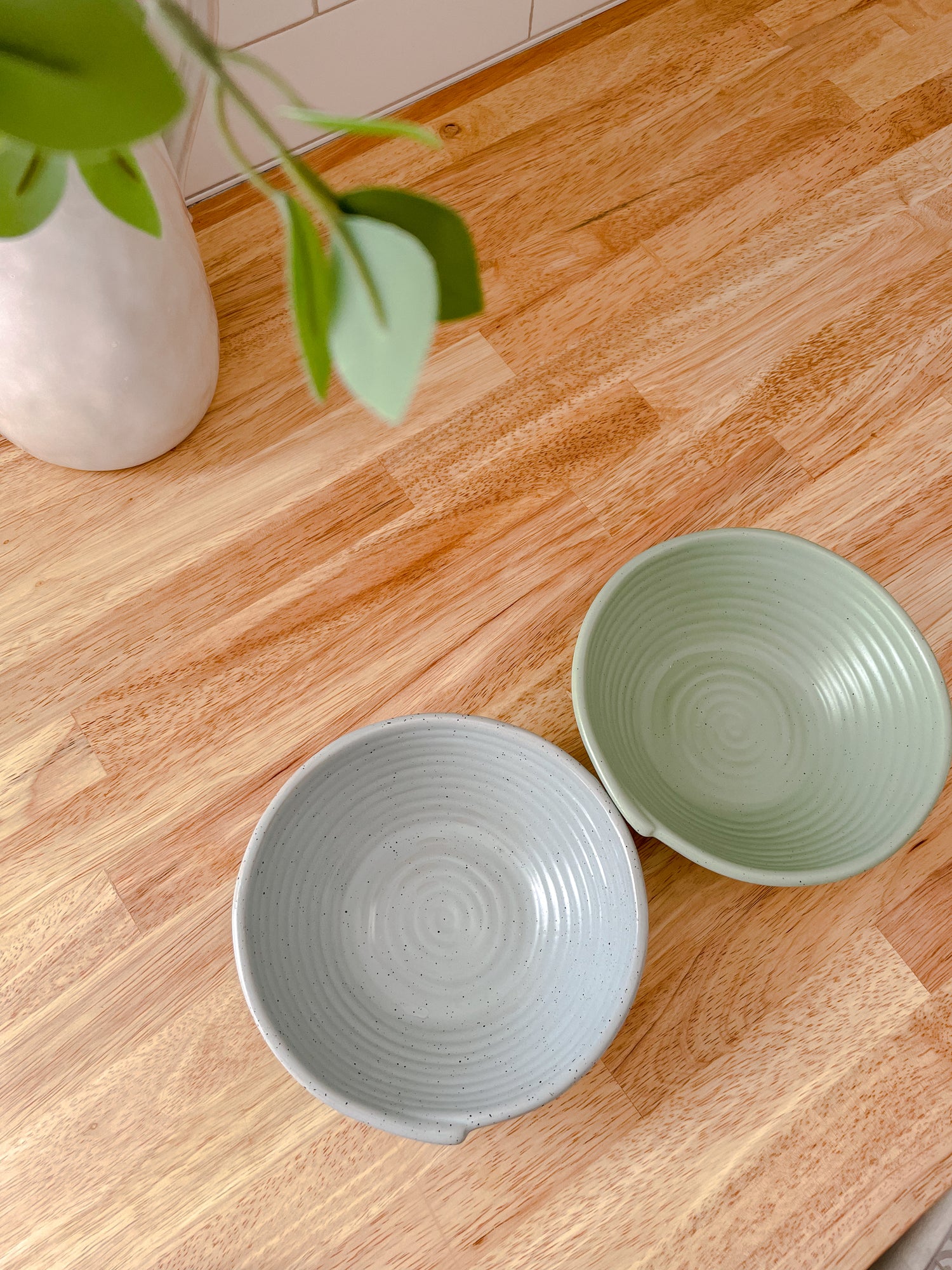 These unique set of bowls are a beautiful addition to any kitchen. Made out of stoneware, they come in 2 muted colors: Sage Green & Light Blue. Each bowl features a unique ribbed texture and matte speckled finish.