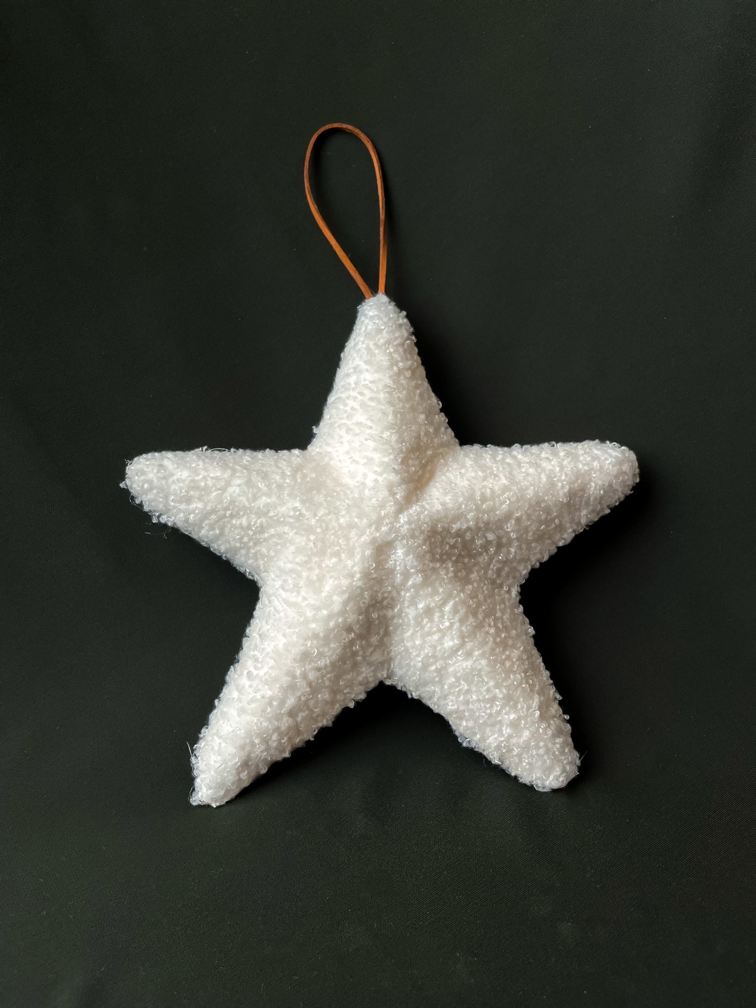 This ornament is a beautiful addition to any Christmas tree. Made out of Sherpa, this star ornament has a neutral cream coloring to it. This ornament easily blends in with other festive decor, and is a one-of-a-kind addition to any tree.