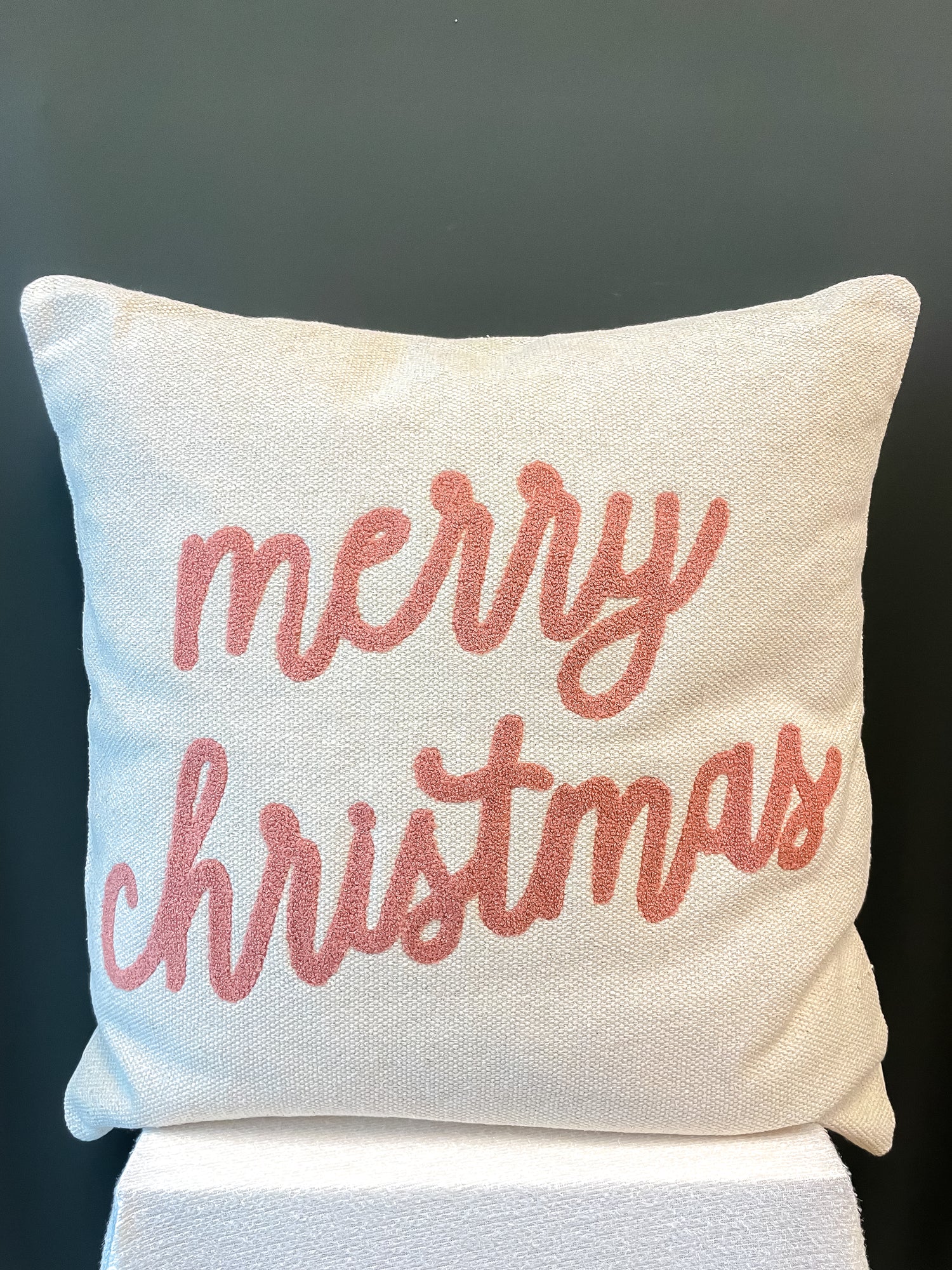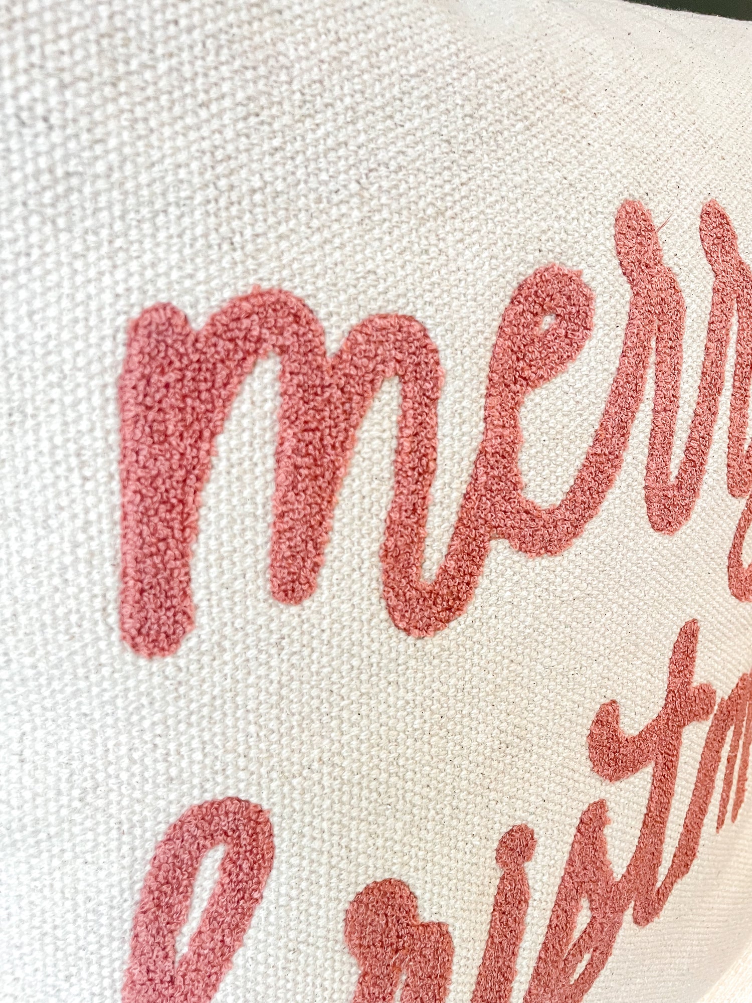 This large pillow reads, "Merry Christmas" in a stunning linen and pink shade. The lettering is a boucle material which makes the pillow even cozier. Toss it on your couch or in a blanket basket for an effortless look.